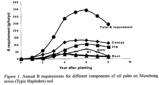The B requirement for stem development was also the highest in the sixth year at 67 g B ha-1 yr-1 before declining sharply as palm competition intensified and growth rate slowed down (Figure 1). In contrast, the B requirement for roots was not only the lowest but also attained its peak earlier at the third year after planting (Figure 1). Thereafter, it required about 9 g B ha-1 yr-1 to sustain root turnover or self pruning of roots.