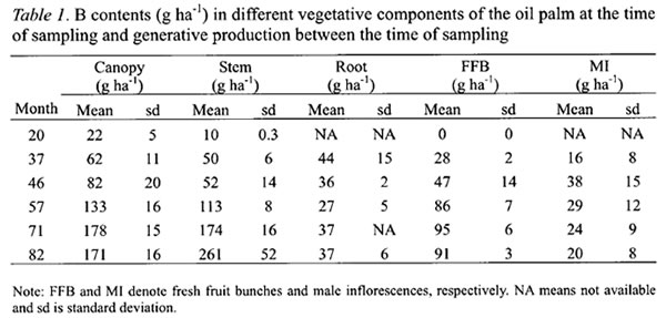 The cumulative B contents for each palm component followed a non-linear regression model (Table 2). The cumulative B contents for canopy and stem fitted well to modified exponential models whereas those for roots and FFB yields to hyperbolic models. The latter implied that the B requirements were relatively constant after their maximum has been attained. The r-squares for all the equations exceeded 0.78.