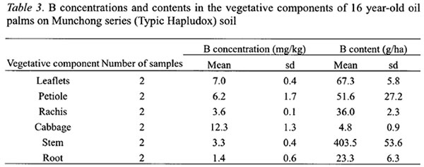 In the second experiment, two 16 years old palms, the interrow vegetation and the frond stacks were sampled to examine the B distribution in an oil palm field at the steady state condition. Sodium borate was applied at an average rate of about 1 kg B ha-1 yr-1.