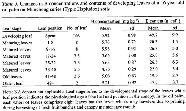 Ng et al . (1968), working with the obsolete Dura planting materials, reported that B concentration in the oil palm canopy was similar to the stem. They did not find any trend in B concentrations between leaves of different ages and concluded that B may be mobile in the oil palm. In contrast, Rajaratnam (1972) using the current Tenera planting materials showed increasing B concentrations from the youngest to the oldest leaf suggesting that B is immobile in oil palm. However, they both agreed that B moves rapidly along the transpiration stream resulting in the accumulation of B at the tips of the oil palm leaf and leaflets.