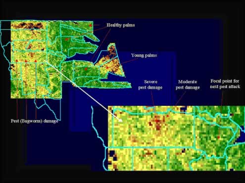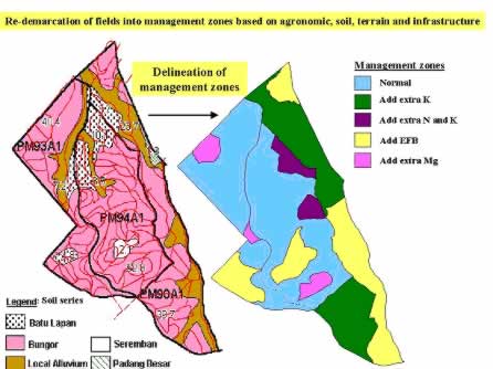 One of the cornerstones of precision farming is to precisely monitor and assess the agricultural enterprise at a local and farm level (Blackmore, 1994). The oil palm industry has religiously collected agronomic and management data at the field level where possible. However, to quote Gohet al . (1999) “Of late, there is a discernible move towards larger manuring blocks in the estates with many of them exceeding 100 ha. The main reasons for this are unknown although the undertone is that management will be easier especially for large estates. Such practice, which is a form of sweeping generalisation, is definitely wrong and will make a mockery out of fertiliser management. It can also easily negate the huge investments in cost, time, manpower and equipment in the preparation of precise fertiliser recommendations”. Similarly, yield data are being combined from many fields rendering them almost useless for assessment purposes. This need not happen if we use remote sensing, GIS, GPS and electronic gadgets such as Palm organisers to collect data digitally at the estate level and adapt information technology such as decision support system to store and collate data and report the results at appropriate scales for the management.