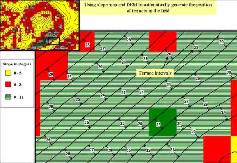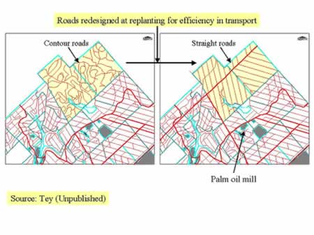 In a good oil palm plantation of 2000 ha, there are approximately 200 km of roads to transport about 50000 tonne of FFB to the mill each year. DEM coupled with decision theory such as shortest path and network with constraints e.g. setting maximum slope of the road at 10% can be used to re-design the road system for more efficient transport of FFB to the mill as shown in Figure 14 (Tey, Unpublished).