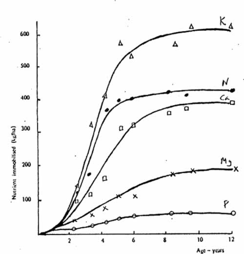 The nutrients immobilized in the plant are shown in Figure 4 where the early very rapid growth rate is reflected in the very rapid nutrient uptake especially of potassium and nitrogen in the first 5 years.